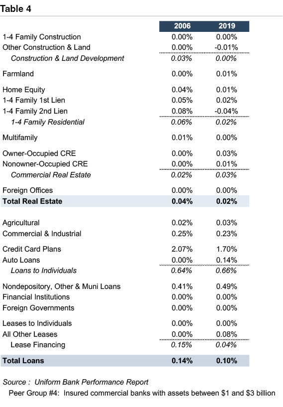 Are these historical loss rates applicable to the current environment?Table 4 compares charge-off rates for banks in Uniform Bank Performance Report peer group 4 (banks with assets between $1 and $3 billion).Loss rates entering the Great Financial Crisis and the COVID-19 pandemic are remarkably similar.