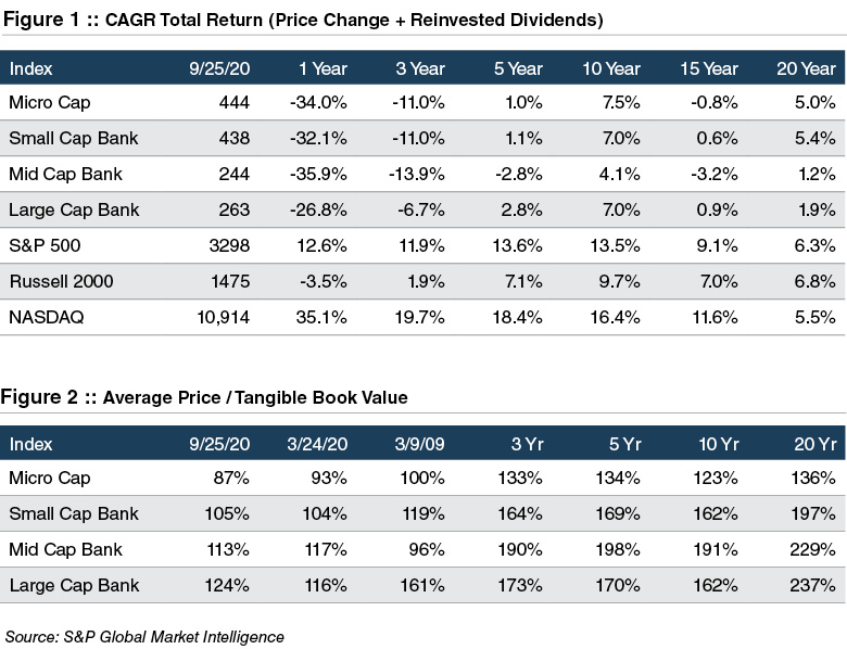 As shown in Figure 1, bank stocks have produced a negative total return that ranges from -27% for the twelve months ended September 25, 2020 for the SNL Large Cap Bank Index to -36% for the SNL Mid Cap Bank Index. At the other extreme are tech stocks. The NASDAQ Composite has produced a one-year total return of 35%–a 70% spread between the two sectors.
