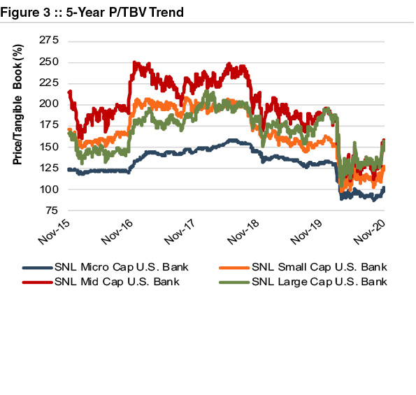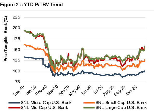 Bank stocks rallied in the first few weeks of November 2020 as the market’s Thanksgiving dinner came early, and it digested several issues including positive news on the COVID-19 vaccine candidates.While significant uncertainty still exists on credit conditions, COVID-19, and the economic outlook, bank valuations and earnings expectations also benefitted from the yield curve steepening as evidenced by the 10-year Treasury moving up from ~50 bps in early August to ~85 bps in mid-November.