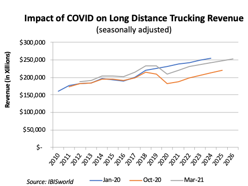 Industrial production and consumer spending, spurred on by the substantial stimulus programs enacted by federal government, have recovered more rapidly than initially expected. This rapid recovery has seemingly reduced the expected long-term impacts of COVID-19 on the long-distance and local trucking industries.