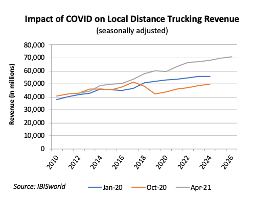 At the beginning of 2020, there were strong predictions for revenue in both the long distance and local trucking industries. Once the COVID-19 pandemic hit, revenues for both parts of the trucking industry dropped along with future revenue predictions. After a few months of lockdowns, the trucking industry began a rapid rebound as a result of businesses reopening and increased online retail. Future revenue predictions from March and April of 2021 from both the long distance and local sectors exceed predictions made in October 2020.