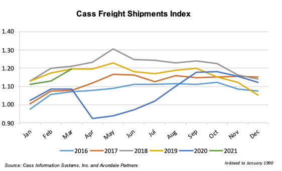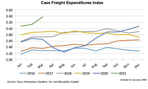 The fall of the number of shipments along with overall truck tonnage caused transportation companies to lower contract and spot rates. Flatbed and reefer rates hit a five-year low in April of 2020, though they rapidly recovered and had surpassed pre-pandemic rates by the fourth quarter of 2020. Truck tonnage has not recovered at the same rate as spot and contract pricing and had not reached pre-pandemic levels by March 2021. These trends are reflected in the Cass Freight and Shipment Indices. While the Shipments index has increased relative to its April 2020 level and has surpassed pre-pandemic levels, the Expenditures index increased over 27% from March 2020 through April 2020.