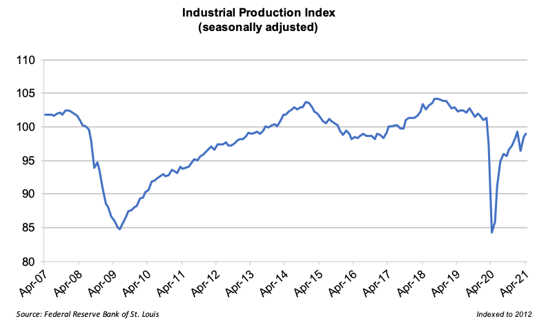 Lockdowns that began in March of 2020, as a result of the pandemic, led to a sharp decline in the Industrial Production Index. The index began a rapid recovery during the summer months of 2020. At the end of the first quarter of 2020, the Industrial Production Index saw a quarter-over-quarter decrease of 16.7% while also being down 17.7% on a year-over-year basis. The index rebounded in the second quarter of 2020 with a quarter-over-quarter increase of 12.7%. The index continually increased over the last three quarters of 2020, but it had not reached pre-pandemic levels as of April 2021.