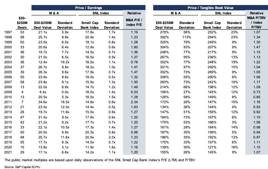 The rebound in M&A activity this year did not occur in a vacuum. Year-to-date through September 23, 2021, the S&P Small Cap and Large Cap Bank Indices have risen 25% and 31% compared to 18% for the S&P 500. Over the past year, the bank indices are up 87% and 79% compared to 37% for the S&P 500.