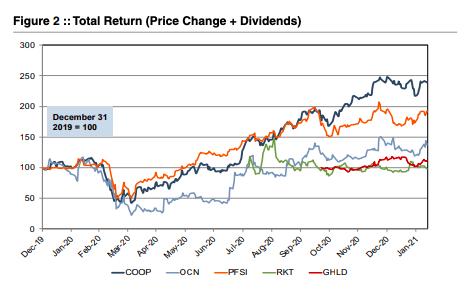 Non-bank mortgage companies found favor with the public markets in 2020 as beneficiaries of the sharp reduction in mortgage rates. In 2021 investor sentiment has faltered due to the impact of rising long-term rates on consensus earning estimates. Several companies undertook IPOs, while another company went public via merging with a SPAC. This expanded the group of non-bank mortgage companies from which to derive valuation multiples and benchmarking information. Figure 2 includes total return data for non-bank mortgage companies.