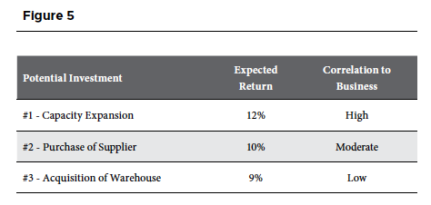 There is no unambiguously correct choice for which investment to make. While the capacity expansion project offers the highest expected return, the close correlation of the returns to the existing business indicates that the project will not reduce the risk—or variability of returns—of the company. At the other extreme, the warehouse acquisition has the lowest expected return, but because the returns on the warehouse are essentially uncorrelated to the existing business, the warehouse acquisition reduces the overall risk profile of the business. The correct choice in this case should be made with respect to the risk tolerances of the shareholders and how the investments fit the strategy of the business.