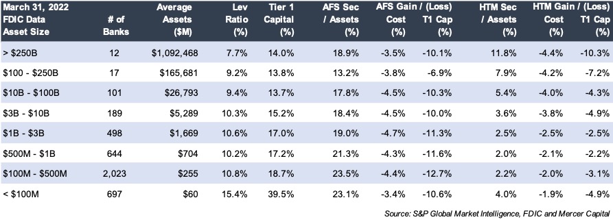 From a valuation perspective, we primarily look to the impact of rising (or falling) rates on a bank’s earnings rather than how changes in rates have impacted the value of the bond portfolio and tangible book value. Assuming an efficient market, the unrealized losses represent the opportunity cost of holding bonds with coupons below the current market rate. If the underwater bonds are sold and immediately repurchased, then the bonds repurchased will produce enough extra income over the life of the bonds to recoup the loss (assuming an efficient market). Further, the AFS securities portfolio is the only asset for most banks that is marked-to-market other than mortgage loans pending sale. Fixed rate residential and CRE loans would have sizable losses, too, if subjected to mark-to-market. Rates have risen, prepayment speeds have slowed and in the case of CRE credit spreads have widened. Also not marked-to-market are deposits.