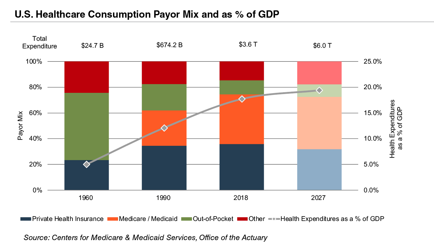 Due to the growing influence of Medicare in aggregate healthcare consumption, legislative developments can have a potentially outsized effect on the demand and pricing for medical products and services.Net mandatory benefit outlays (gross outlays less offsetting receipts) to Medicare totaled $776 billion in 2020 and are expected to reach $1.5 trillion by 2030.