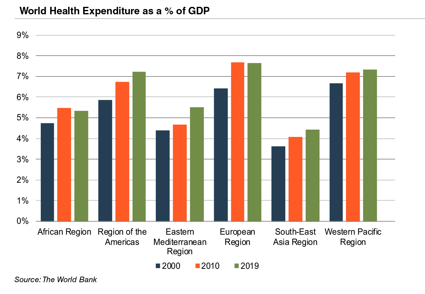 Emerging economies are claiming a growing share of global healthcare consumption, including medical devices and related procedures, owing to relative economic prosperity, growing medical awareness, and increasing (and increasingly aging) populations. According to the WHO, middle income countries, such as Russia, China, Turkey, and Peru, among others, are rapidly converging towards outsized levels of spending as their incomes increase.When countries grow richer, the demand for health care increases along with people’s expectation for government financed healthcare.Middle income country share, the fastest growing economic sector, increased from 15% to 19% of global spending between 2000 and 2017.As global health expenditure continues to increase, sales to countries outside the U.S. represent a potential avenue for growth for domestic medical device companies.According to the World Bank, all regions (except Sub-Saharan Africa and South Asia) have seen an increase in healthcare spending as a percentage of total output over the last two decades.