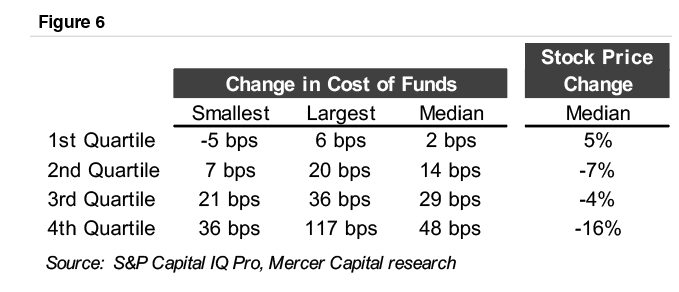 As we found out in 2022, some core deposits are more core than others. One of the strongest determinants of stock price performance in 2022 was the change in the cost of funds. We evaluated the change in the cost of funds from the first through the third quarters of 2022.3 As indicated in Figure 6, banks in the first quartile reported a median increase in the cost of funds of two basis points, whereas banks in the fourth quartile reported a median increase of 48 basis points. Further, banks in the first quartile reported a median stock price change of positive 5% in 2022, versus negative 16% for the fourth quartile banks.