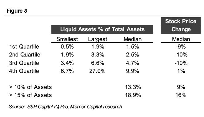 Figure 8 shows short-term liquid assets as a percentage of total assets. Most banks operate with short-term liquid assets in a relatively tight range (under 5% of total assets); thus, limited correlation is evident between exposure to short-term liquid assets and performance. However, a more positive relationship begins to emerge in the tail of the distribution. Banks in the fourth quartile reported liquid assets of 9.9% and a positive 1% stock price change. Narrowing the fourth quartile banks to those with liquid assets exceeding 10% or 15% of total assets results in stronger share price changes of positive 9% and 16%, respectively.
