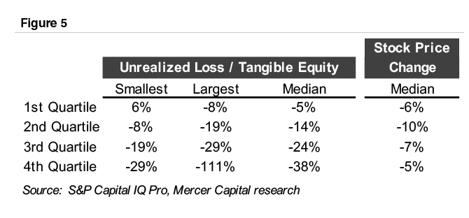 Our view is that the unrealized loss on securities should be evaluated in the context of the entire balance sheet. We would be more concerned, from a valuation standpoint, when a large unrealized loss is coupled with a heavier exposure to fixed rate loans, particularly if the bank is facing pressure on deposit rates.
