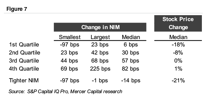 An analysis of net interest margin expansion between the first and third quarters of 2022 shows a similar result. Banks in the first quartile reported a median change in NIM of six basis points and a stock price change of negative 18%, while banks in the quartile with the most NIM expansion—82 basis points for the median fourth quartile bank—eked out a 1% positive share price appreciation.