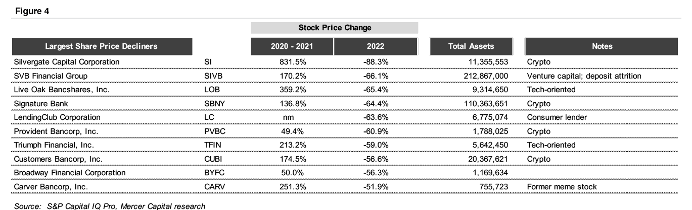 Some of the market leaders in 2020 and 2021 crashed out of favor in 2022, such as those embracing crypto or positioning themselves as technology leaders rather than stodgy, traditional banks. Figure 4 presents the ten banks with the largest negative returns in 2022.