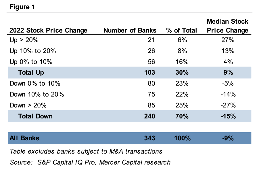 Given this backdrop, publicly traded banks did comparatively well. The median stock price change among the 343 banks and thrifts traded on the NASDAQ and NYSE was negative 9% in 2022, relative to negative 19% for the S&P 500 and negative 33% for the NASDAQ. Further, there was more dispersion in performance during 2022.