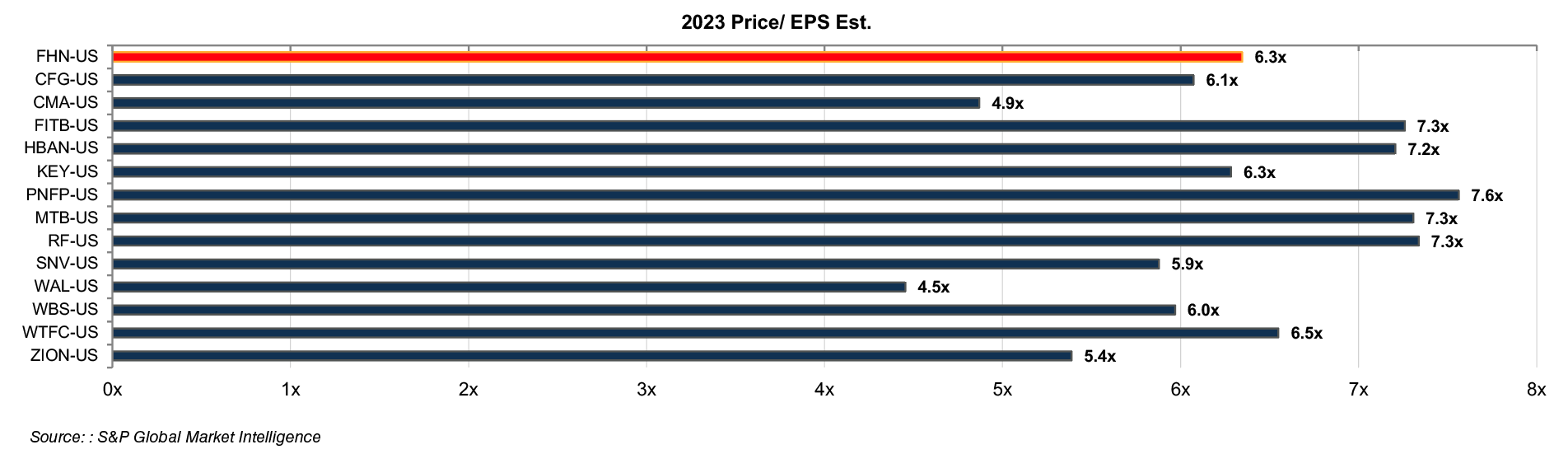 When FHN released 1Q23 earnings on April 19 without any updated written commentary about the then pending TD deal (FHN discontinued quarterly conference calls once the deal was announced), the shares did not move much given the then 26% discount to the $25 per share cash price. However, the shares fell to about $10 per share with the announcement that the parties terminated the deal on May 4.