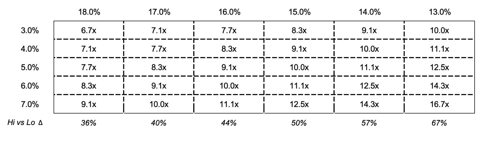 Most venture-backed firms and sometimes PE-owned companies can be described as long duration equities in which the value of the firm is in the out years rather than near-term cash flows as is the case for mature businesses with high profit margins. Like any model, terminal values have their sensitivities including and especially growth.