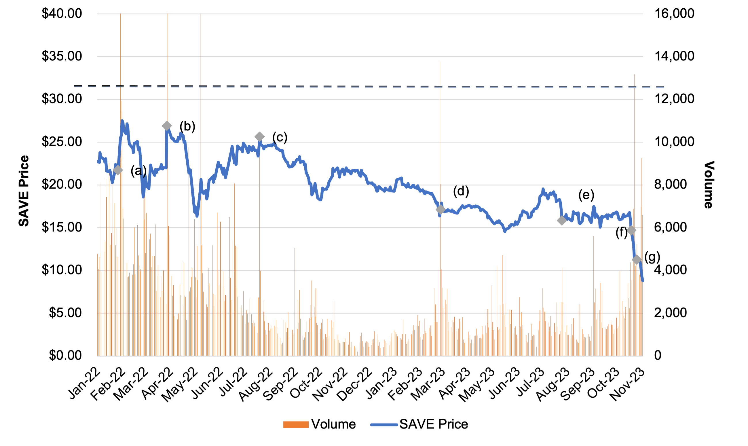 - July 28, 2022 - Spirit agreed to be acquired by JetBlue for a) $33.50 per share of cash, or $3.8 billion, with $2.50 per share payable upon approval of the deal by Spirit shareholders; b) a monthly ticking fee of $0.10 per share up to $0.65 per share commencing in January 2023; and c) $70 million termination fee if the agreement is terminated for failure to obtain regulatory approval.