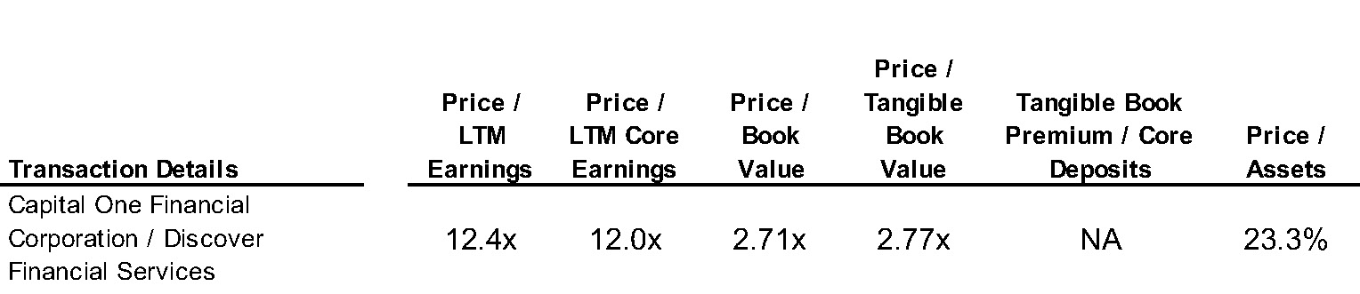 The two companies entered into a definitive agreement on February 19, 2024, in which Capital One Financial Corporation agreed to acquire Discover Financial Services in an all-stock transaction valued at $35.3 billion.The deal represents a 26.6% premium to Discover’s closing price of $110.49 (2/26/24) as Discover shareholders will receive 1.0192 Capital One shares for each Discover share.More details on the transaction as well as the companies’ financials as of fiscal 2023 are displayed on the right.