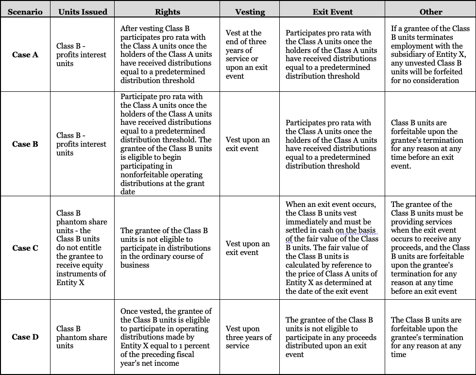 The illustrative example provided in ASU 2024-01 (Cases A, B, C, and D) offer valuable insights into scenarios that entities may encounter when assessing the accounting treatment for profits interest awards. The first two cases describe profits interests that fall within the scope of ASC 718. The second two cases describe phantom share unit awards, one of which would be accounted for under ASC 718 and one that would not.