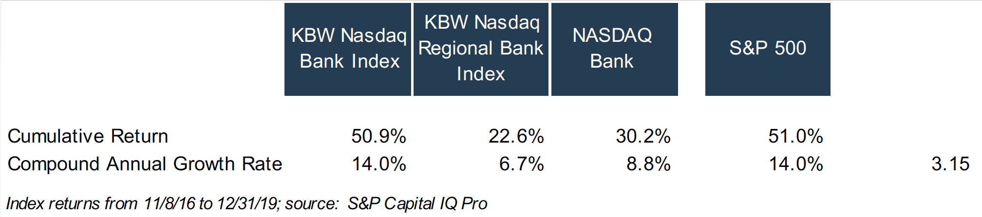 The table below shows bank stock index returns from November 8, 2016 (election day in 2016) to December 31, 2019 (pre-COVID). Index performance varied, but the Nasdaq Bank Index increased by a cumulative 30%, which equates to an 8.8% compound annual growth rate.