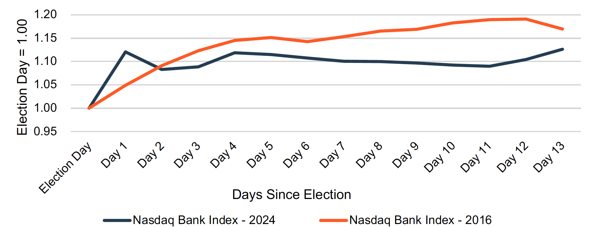 We reviewed bank stock indices immediately after the 2016 and 2024 elections. Immediately after the 2024 election, bank stocks were almost as popular as Moo Deng, as the Nasdaq Bank Index rose by 12% the first day after the election (see chart above). Then, bank stocks remained relatively stable before increasing again 12 and 13 days after the election. The situation was somewhat different in 2016, with positive changes in the index compounding over many days. Of the first 13 trading days after the election, the Nasdaq Bank index increased for 11 days after the 2016 election versus only five days after the 2024 election. Cumulatively, the index increased by 13% the first 13 days after the 2024 election relative to 17% after the 2016 election. This compares to a 3.2% increase for the S&P 500 in the 13 days after the 2024 election, similar to the 2.9% increase after the 2016 election.