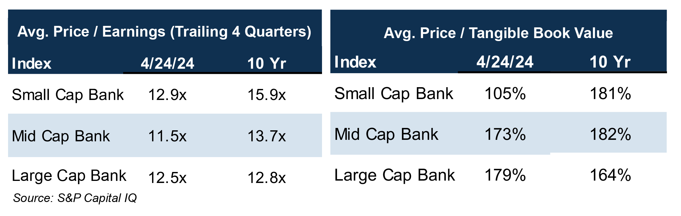 As shown in the following tables, small and mid cap public bank stocks have underperformed broad market indices, and valuation multiples (as measured by P/E and P/TBV) remain below long-term historical averages.